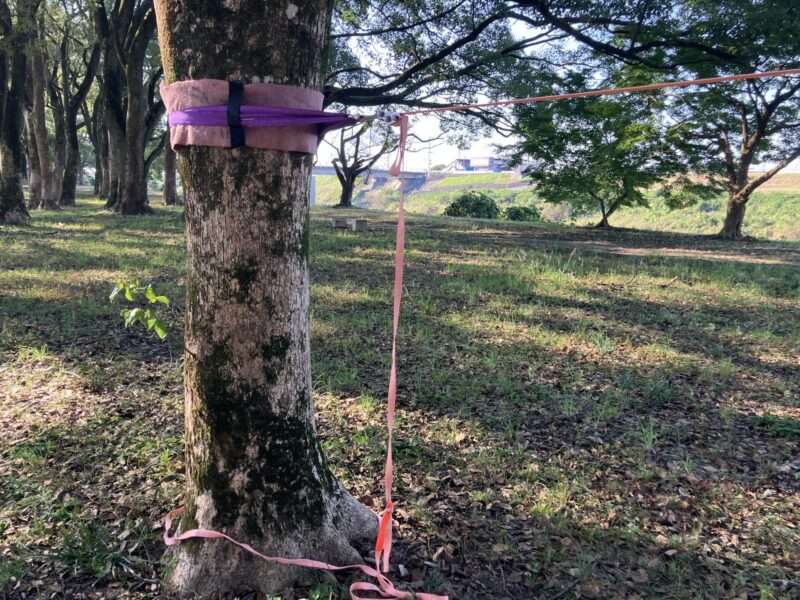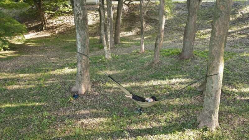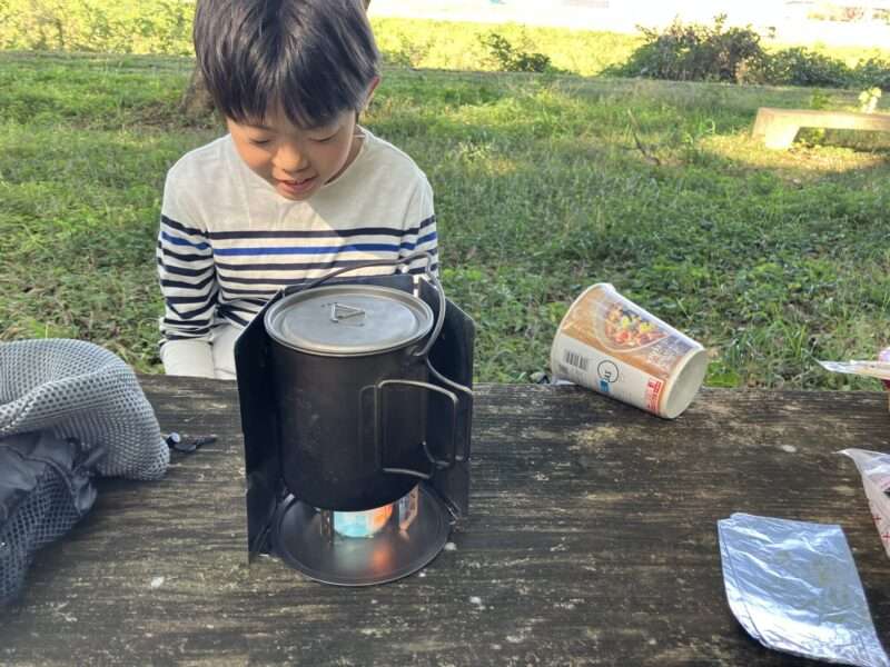 自宅からは車で5分。林を歩くと巨木がある。テーブルもあるから良い場所。コンビニで昼飯を買ってきたので固形燃料でお湯を沸かす。