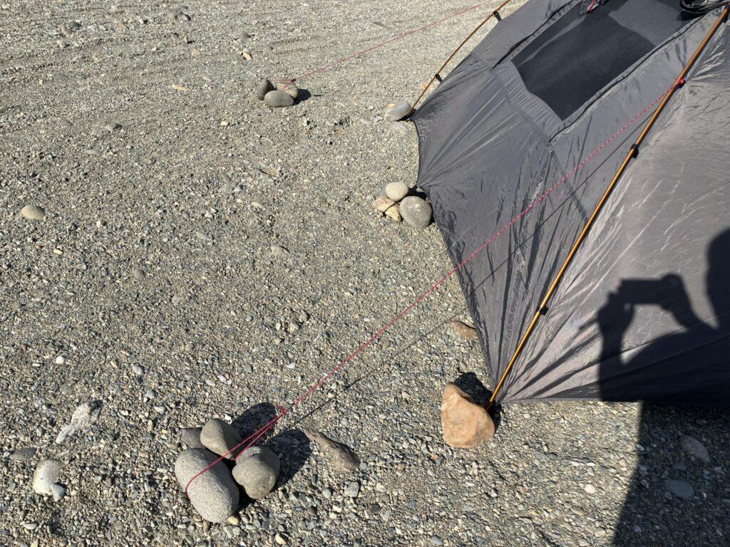 テントマットは厚めにして、スリーピングマットも厚めがいいですね。下がごつごつだから。ペグは効かないので石にロープを結びましょう。