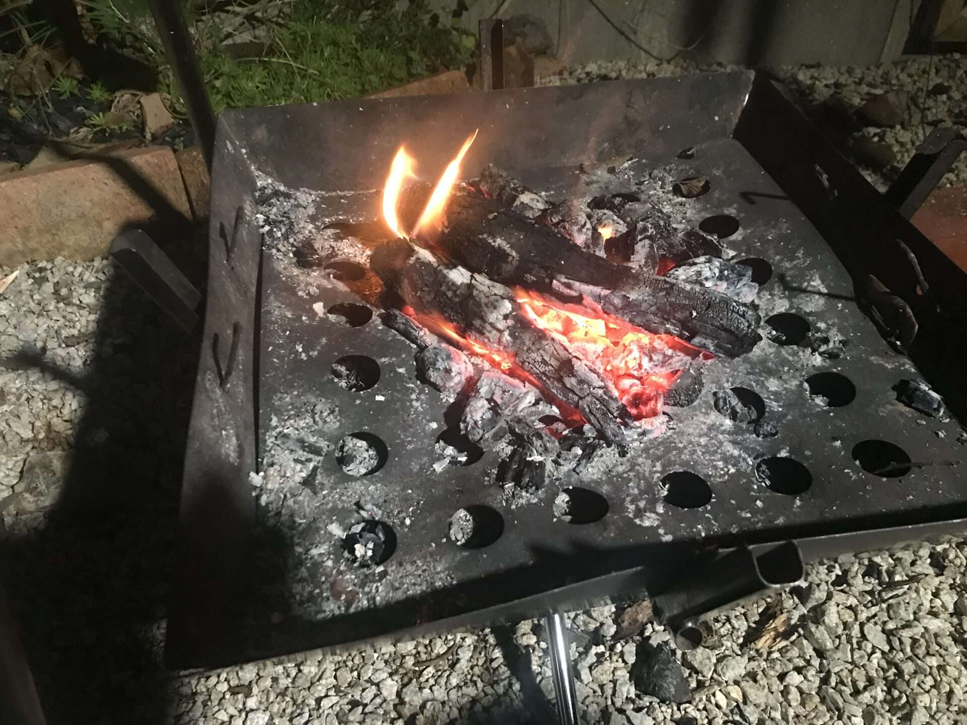 火が消えてきたら焚火や焚火台があればそのまま燃やします。あとで針金を回収してください。