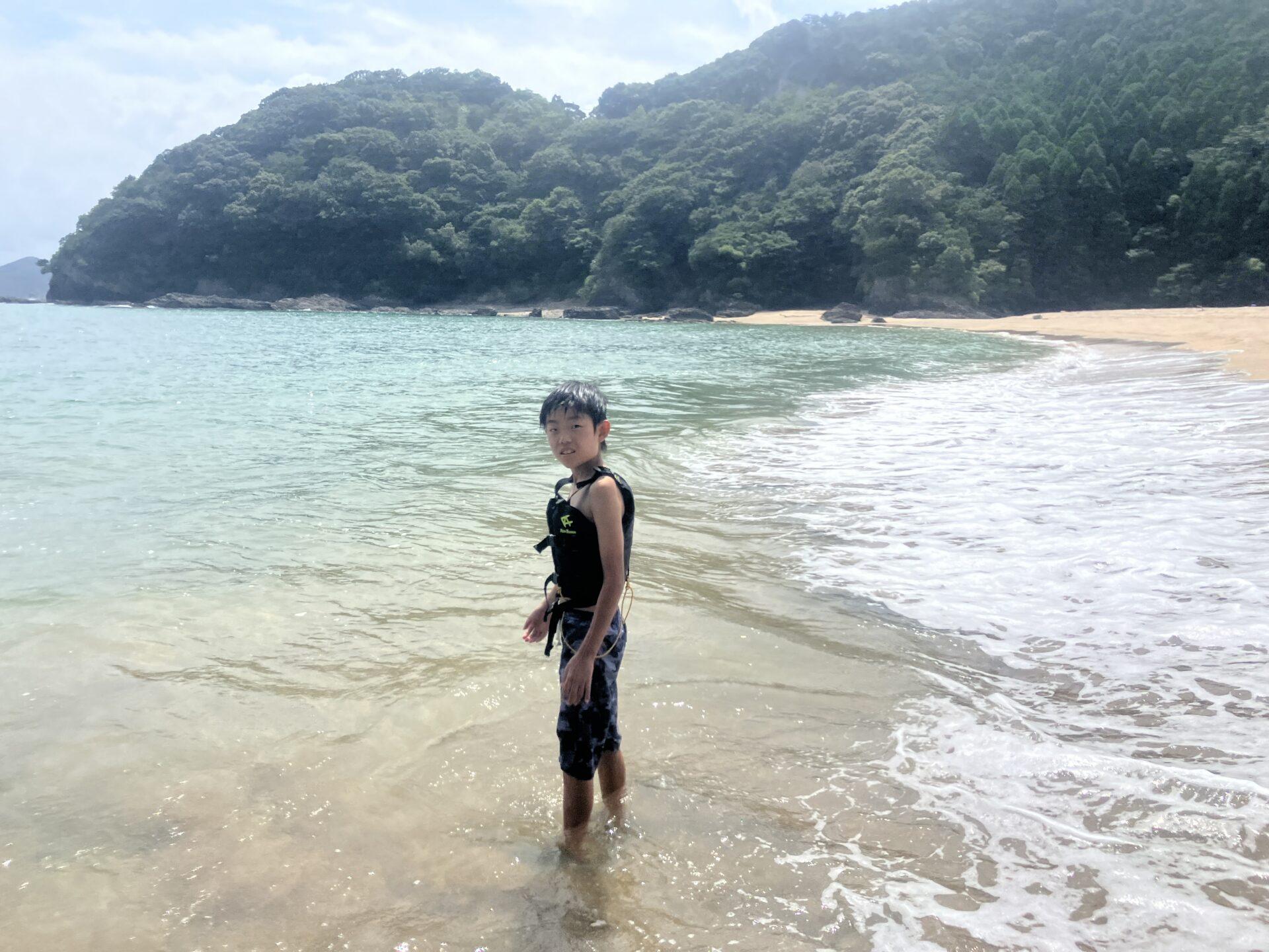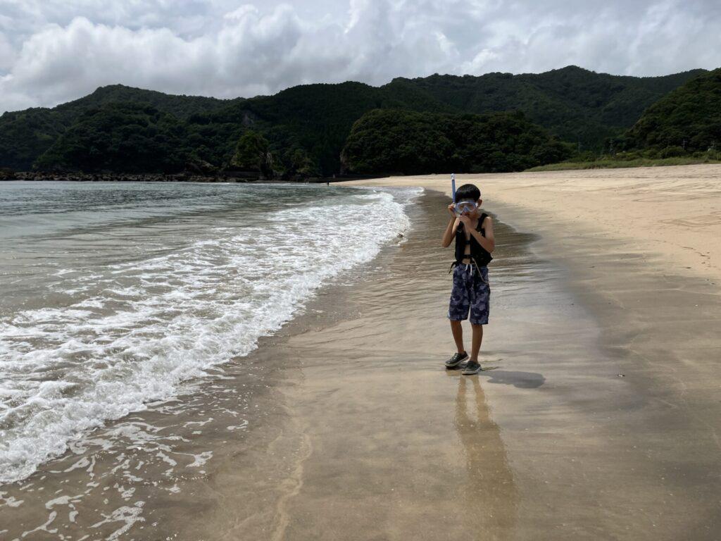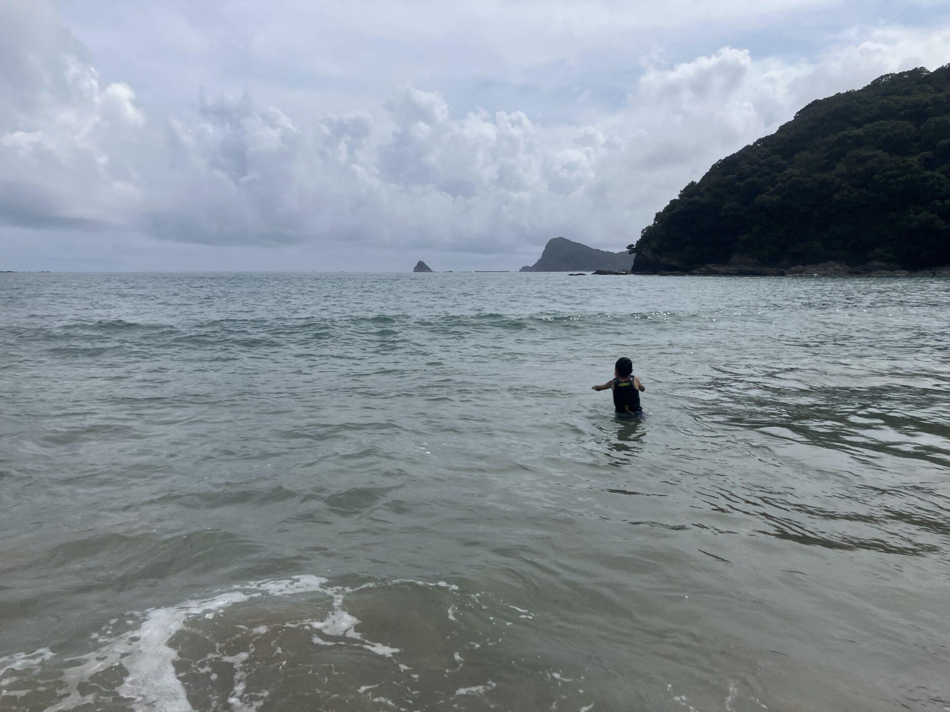全く人がいない浜でひたすら波に翻弄されて遊ぶ。吹き飛ばされるのが楽しいらしい。時々大きい波が来る。魚やヤドカリ等は少なめ。
